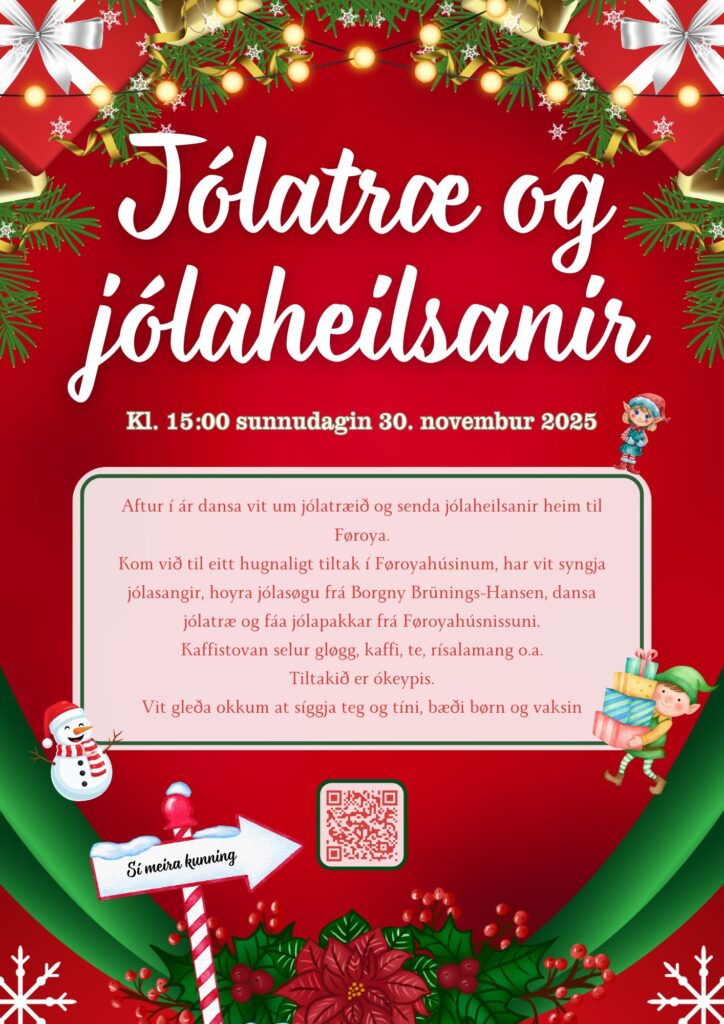 Sum siðvenja er í Føroyahúsinum dansa vit aftur í ár um jólatræið og senda jólaheilsanir heim til Føroya. Hugnaliga haldið verður fyrsta sunnudag í advent, 30. novembur, kl. 15:00 Vit syngja jólasangir, Borgny Brünings-Hansen, prestur, lesur søgu, vit dansa um jólatræið og børnini fáa pakkar frá Føroyahúsnissuni. Kaffistovan selur gløgg, kaffi, te, rísalamang o.a. Tiltakið er ókeypis. Vit gleða okkum at síggja teg og tíni, bæði børn og vaksin