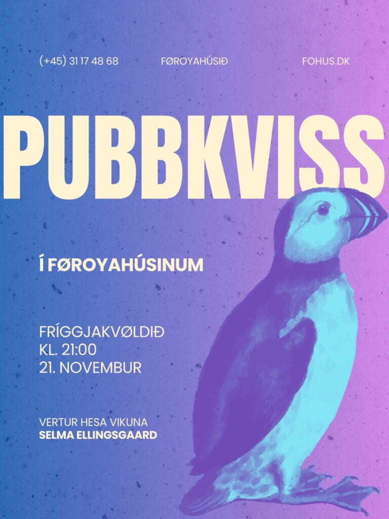 Fríggjakvøldið, 21. novembur kl. 21:00 er pubbkviss aftur á skránni. Dyrnar lata upp kl. 20:00 – Og annars er kaffistovan opin frá kl. 13:00 – 17:00 Selma Ellingsgaard er kvissvertinna hetta kvøldið, og stendur fyri hugfloygdu, stuttligu og fjøltáttaðu spurningunum, ið bjóða vitan tíni um m.a. politikk, ítrótt, tónleik, mentan og landalæru av. – Til tykkara kunnleika, so hava vit føroysk bløð og fleiri borðspøl at stytta sær stundir við. Internetið er gott, so tað er eisini lag á manni hjá lesandi at sita og arbeiða í hugnaligu hølunum.