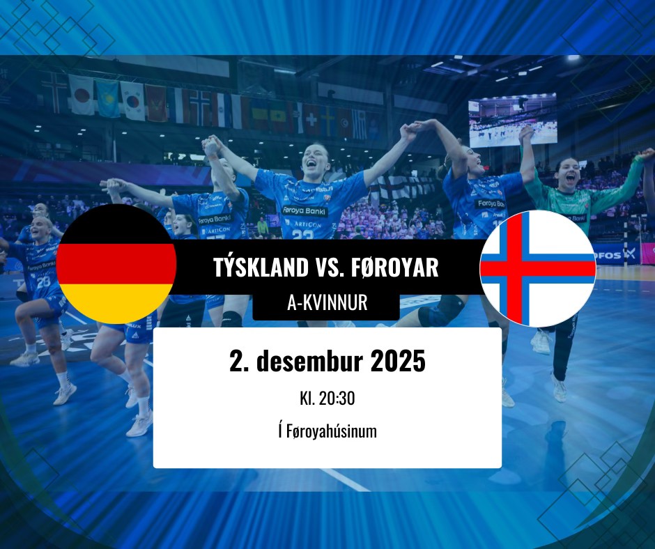Í kvøld, týskvøldið, 2. desembur, vísa vit spennandi dystin í HM-endaspælinum millum Føroyar og Týskland. Føroysku hondbóltskvinnurnar gjørdu tað bragd at vinna á Spaniu og síðani eisini á Paraguai, og hava 2 stig við í miðumfarið, og fyrsta mótstøðuliðið verður Týskland. Dysturin verður leiktur í Westfalenhalle í Dortmund. Dysturin byrjar kl. 20:30 danska tíð og dyrnar lata upp kl. 20:00 – júst sum áhugaverda tiltakið “Seinna helvt av lívinum: Frá ego til sál” hjá Duritu Holm er av í Føroyahúsinum.
